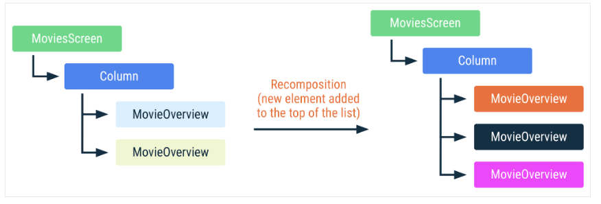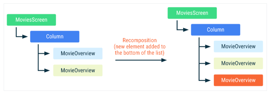 위의 코드에서는 컴포저블을 단순히 반복해서 추가하는 형태(맨 아래에)이다. 따라서 새롭게 추가해봤자 재구성되는(인스턴스가 새로 생성되는) MovieOverview는 단 하나다.