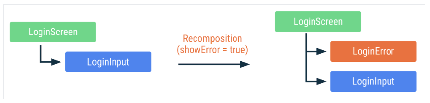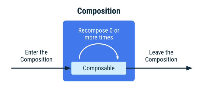 컴포저블은 컴포지션을 시작하고 0회 이상 재구성되며 컴포지션을 종료하게 되는데 일반적으로 State<T> 객체가 변경되면 트리거 된다. 컴포지션에서 특정 State<T>를 읽는 모든 컴포저블 및 호출하는 컴포저블 중 건너뛸 수 없는 모든 컴포저블을 실행하게 된다.