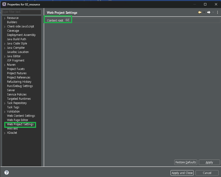 - [해당 프로젝트] → [Web Project Settings] → [Context root: 02_resource → 02 ]