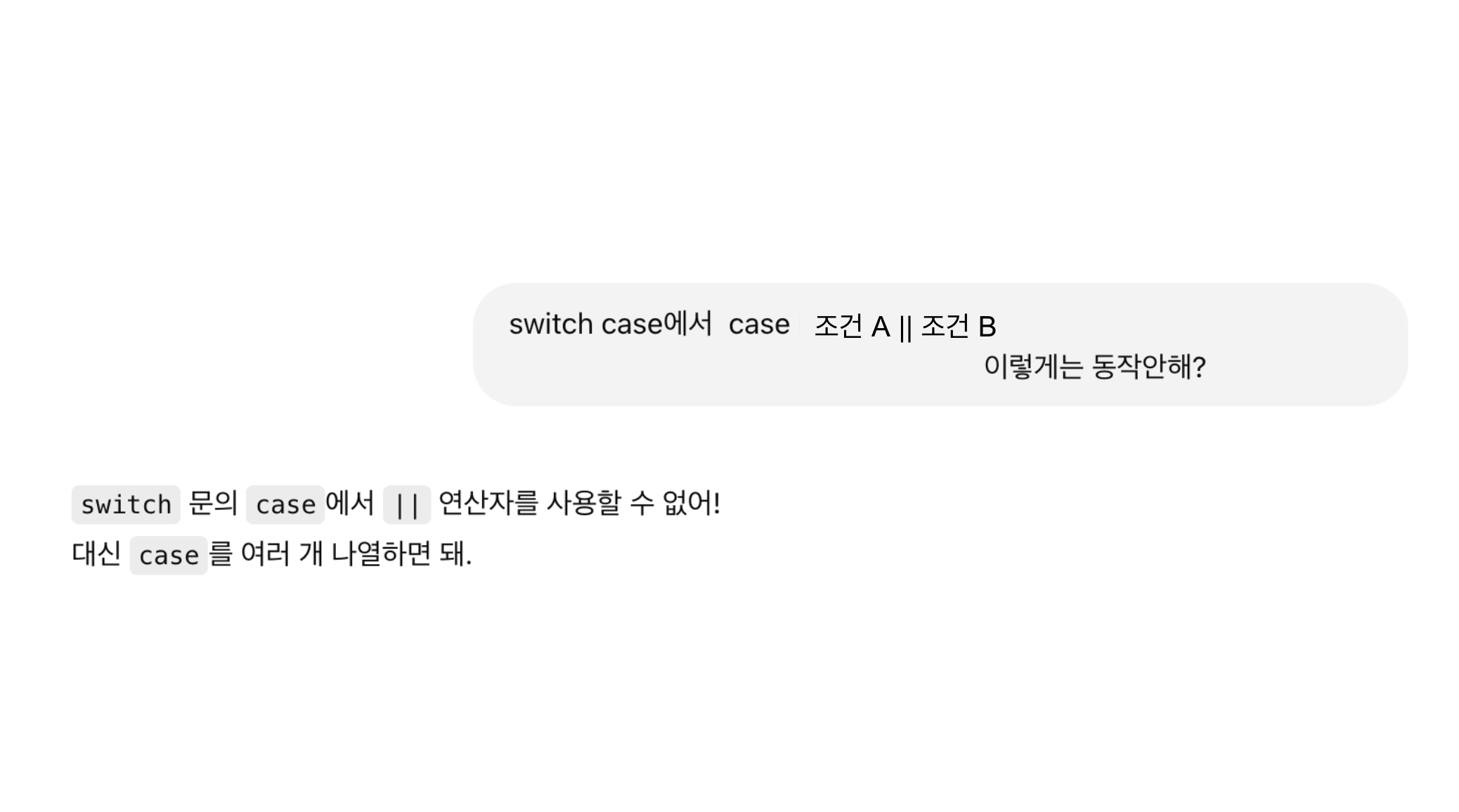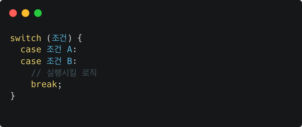 case 문 내의 조건 A || 조건 B 가 먼저 평가되어, 결국 case: true 또는 case: false 와 같이 실행된다.
