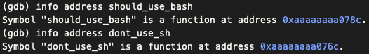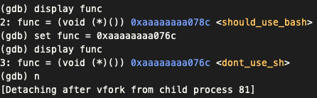 set 명령어를 통해 func에 할당된 주소를 shoud_use_bash에서 dont_use_sh로 변경하였다.