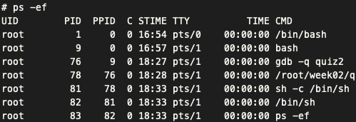 b : 중단점 설정r : 프로그램 실행n : 다음 코드로 이동display : 변수 상태 출력info address: 주소 출력sh를 실행했을 경우 ps -ef를 통해 확인되는 프로세스 목록이 다를 것이다.