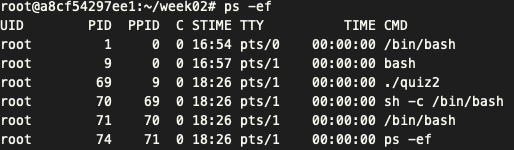 터미널이 바뀜을 확인하였고, ps -ef를 통해 확실히 확인하였다. (/bin/sh가 실행 중!)
