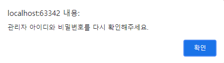 alert("관리자 아이디와 비밀번호를 다시 확인해주세요.")