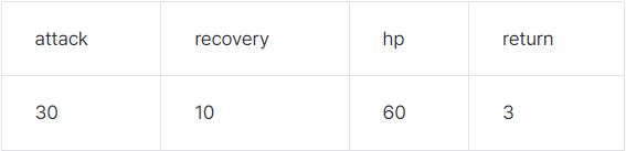 캐릭터의 공격력 attack과 몬스터가 자신의 차례에 회복 하는 체력 recovery, 몬스터의 초기 체력 hp가 solution 함수의 매개변수로 주어집니다.