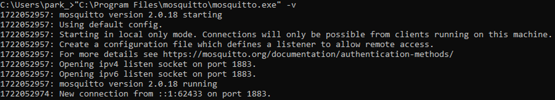 C:\Program Files\mosquitto입니다.mosquitto.conf 설정 파일을 편집하여 필요에 따라 설정을 변경할 수 있습니다."C:\Program Files\mosquitto\mosquitto.exe" -vv 옵션은 verbose 모드로 실행하여, 브로커의 상태를 실시간으로 확인할 수 있습니다.