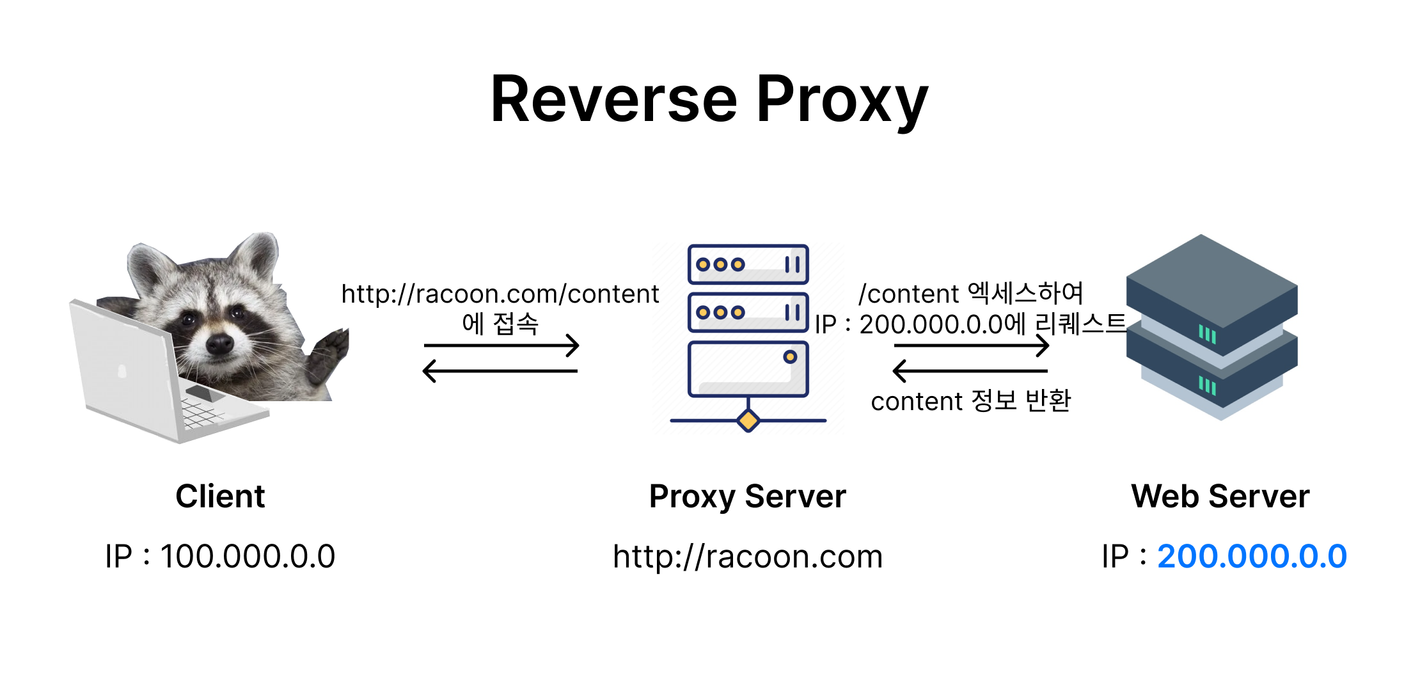 - 클라이언트 요청을 대신 받아 내부 서버로 전달해 주는 것을 리버스 프록시라고 하는데 서버 정보를 클라이언트로부터 숨겨줌