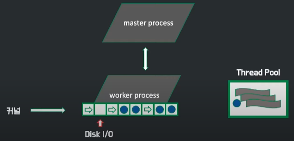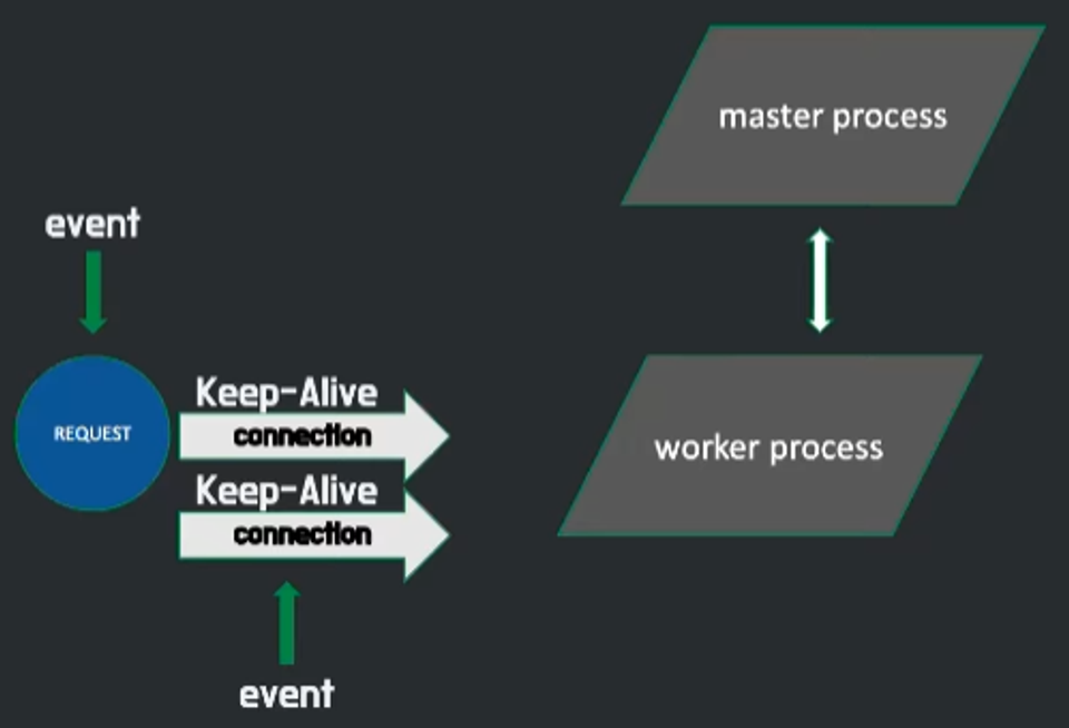 - 이렇게 되면 worker process가 쉬지 않고 계속해서 일을 하기 때문에 자원을 효율적으로 사용 가능(apache는 요청이 없다면 프로세스가 방치됨)