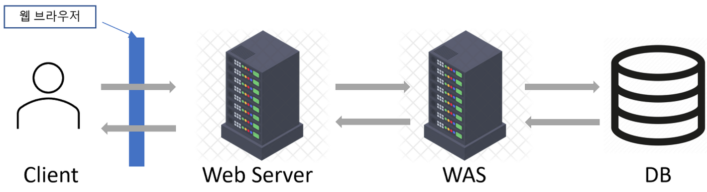 - 요청 : 클라이언트 > 웹 서버 > WAS > DB