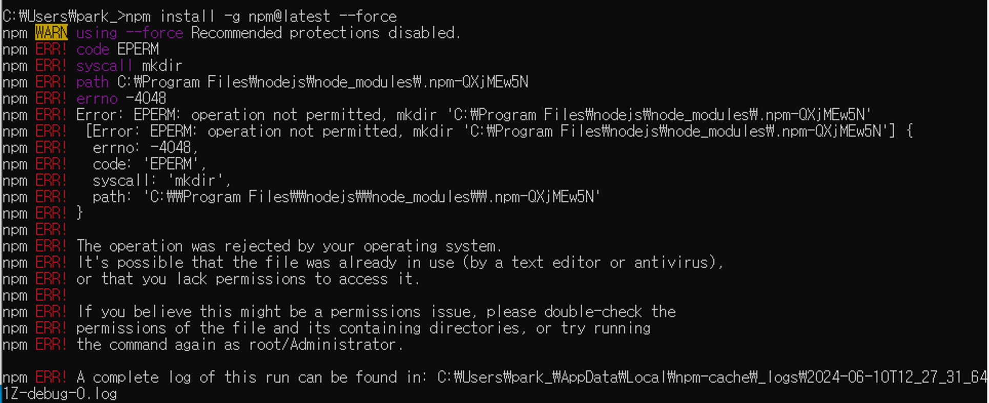 강의를 따라하다가 npm install -g create-react-app 과 같은 것을 cmd(일반 모드)에서 쳤는데, 에러가 발생