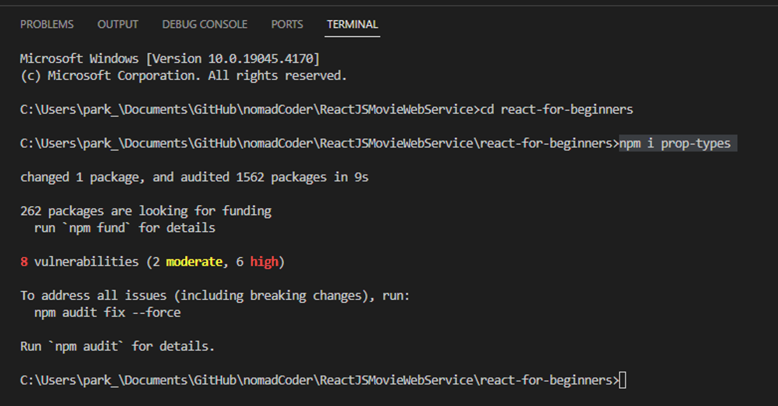 ⇒ termianl 창에서 [ “npm i prop-types ”]하여 설치