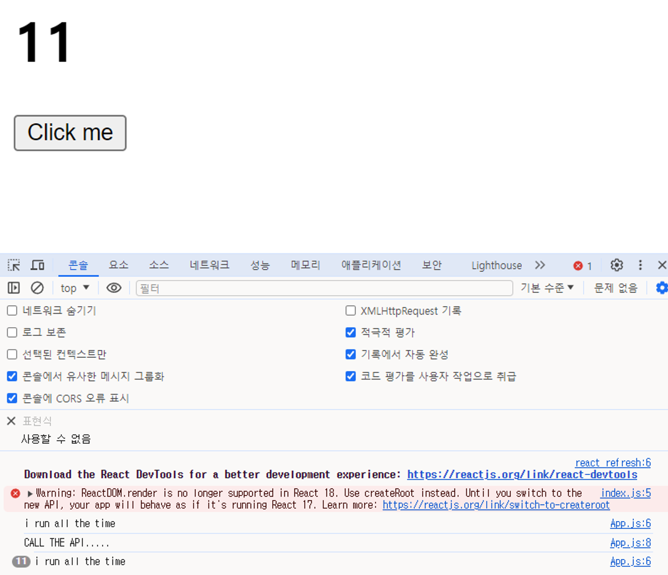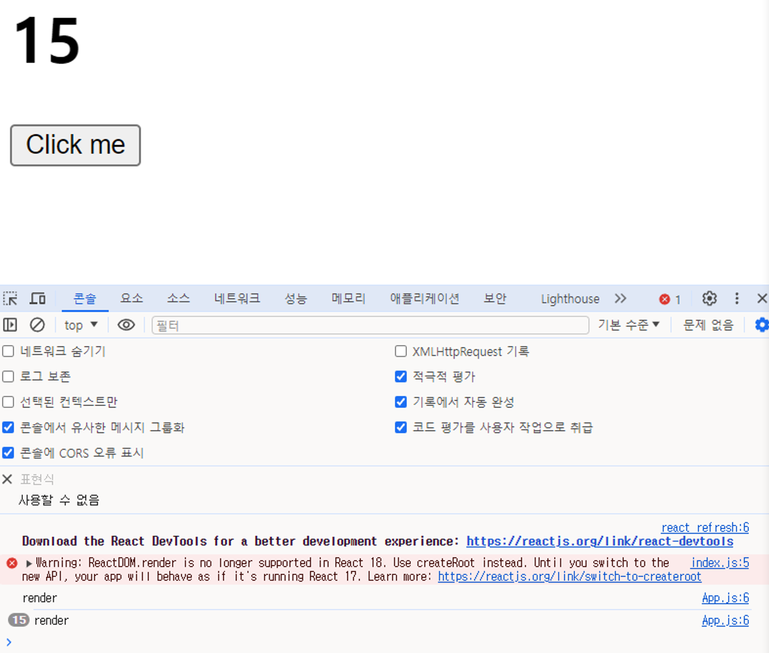 - 지금은 Click me 버튼을 통해서 render라는 값을 Console 창에 log로 남기고 있는 상황.