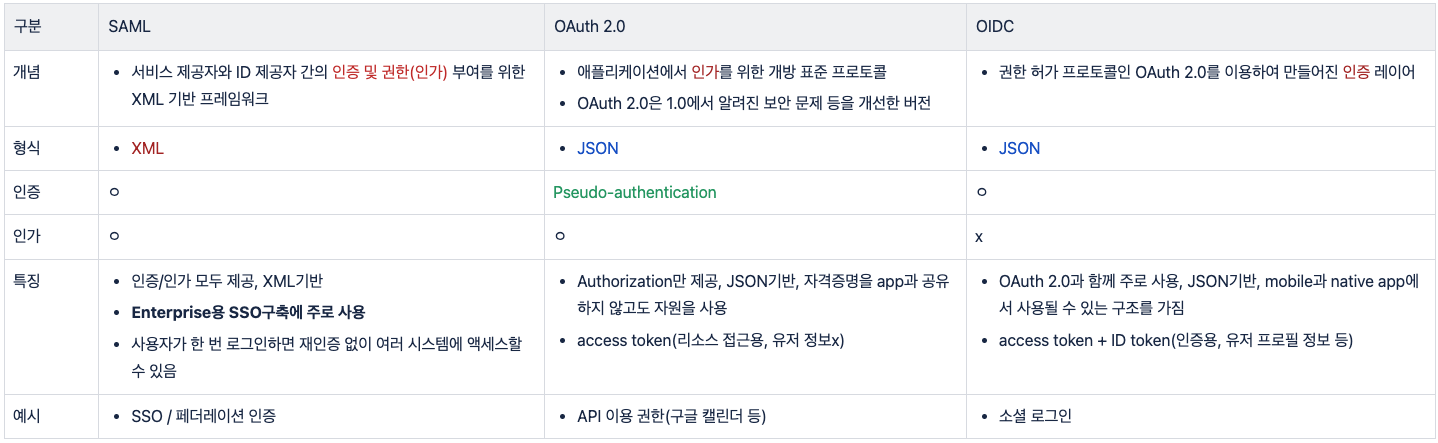 - OAuth(인가), OpenID Connect(인증), SAML(인증&인가)의 특징 및 차이점
