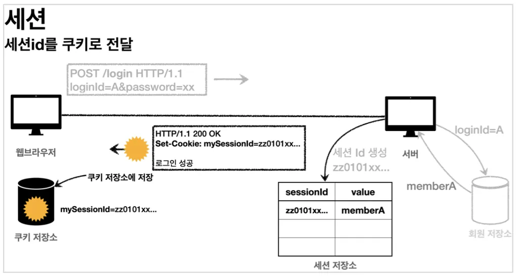 mySessionId 쿠키를 생성한다.mySessionId 값으로 추정 불가능한 랜덤 값을 할당한다.mySessionId와 member를 묶어 보관하고 클라이언트에는 mySessionId만 전달한다.mySessionId를 저장한다.→ 로그인 상태