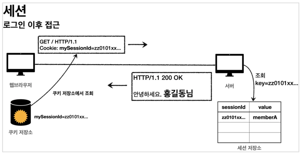 위에서 말했든, 로그인 이후에도 User가 로그인 상태를 유지한 채로 서비스를 이용할 수 있게 하기 위해 ‘세션’ 또는 ‘쿠키’를 이용한다고 말했다. 좀 더 개발자스럽게 이야기를 하면, 아래와 같다.