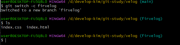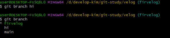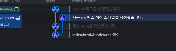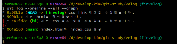 이제 내가 firvelog브랜치 에서는 html을 개발하였고 한 사람은 hi 브랜치에서 css를 개발하였다고 가정해보자