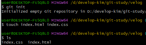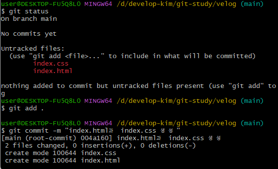 그 뒤에 index.html index.css를 생성해주었을때 git은 항상 파일이 수정되거나 생성이 되었을 때는