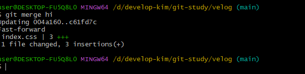 css작업을 한 hi 브랜치가 main브랜치로 이동을 한 것이고 이것을 FAST-FORWARD 라고 한다.