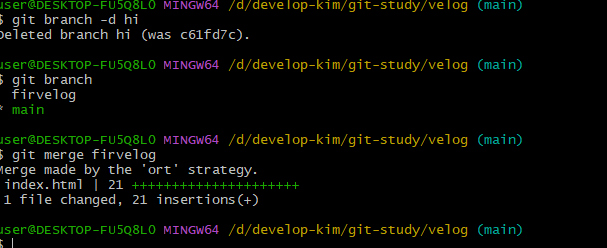 hi브랜치를 제거해주고 firvelog와 merge해보자