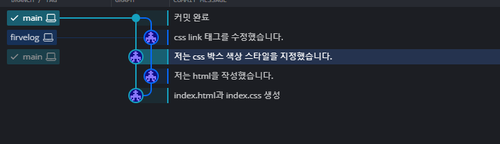 main브랜치에 hi라는 브랜치와 firvelog가 나눠져 있고 총 몇번 커밋을 한지 보여지게 된다.