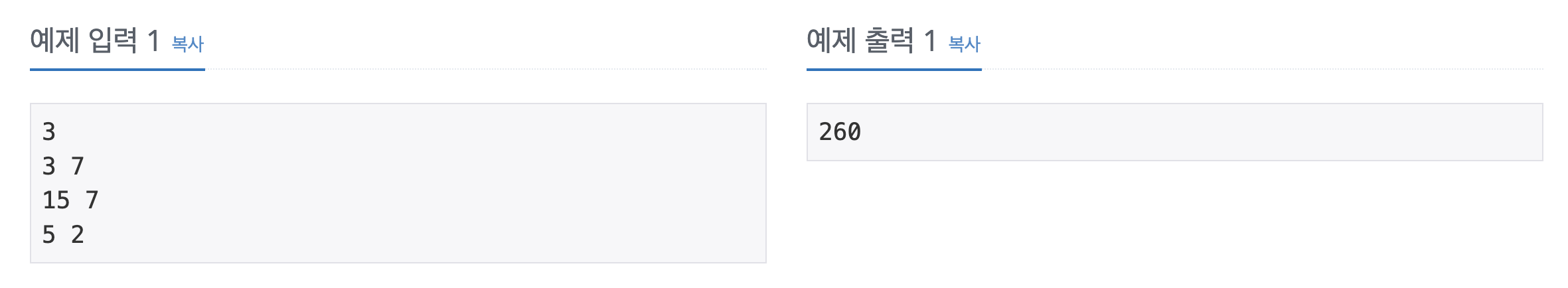 첫째 줄에 색종이의 수가 주어진다. 이어 둘째 줄부터 한 줄에 하나씩 색종이를 붙인 위치가 주어진다. 색종이를 붙인 위치는 두 개의 자연수로 주어지는데 첫 번째 자연수는 색종이의 왼쪽 변과 도화지의 왼쪽 변 사이의 거리이고, 두 번째 자연수는 색종이의 아래쪽 변과 도화지의 아래쪽 변 사이의 거리이다. 색종이의 수는 100 이하이며, 색종이가 도화지 밖으로 나가는 경우는 없다.
