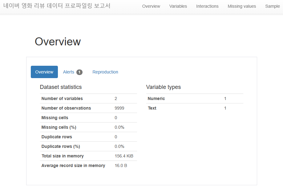 pf_movie = ProfileReport(movie_df, title = "네이버 영화 리뷰 데이터 프로파일링 보고서")