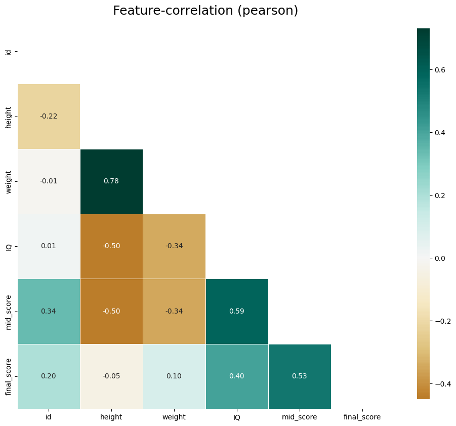 weight와 height가 강한 양의 상관관계(0.78)를 보인다.