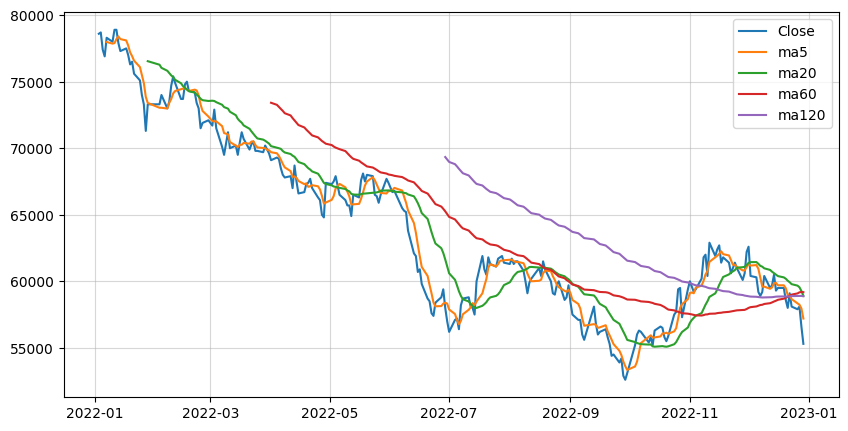 : m일의 평균을 구해본다고 가정한다면, n번째 데이터의 단순이동평균 = n번째 데이터를 포함한 왼쪽 m개의 데이터의 산술평균