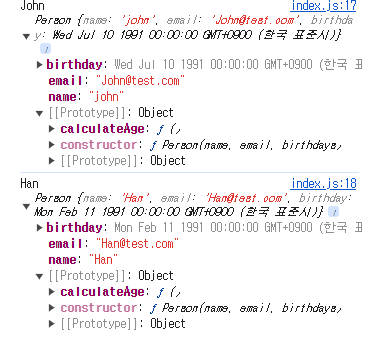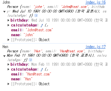 prototype에 calculateAge함수를 넣어 재사용한다.