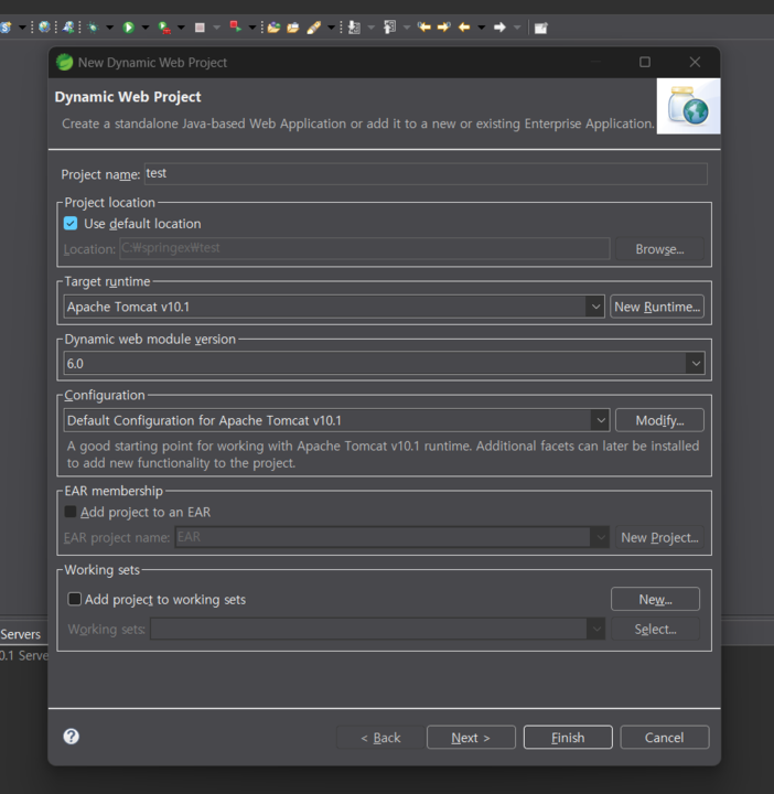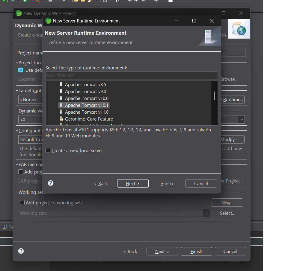target runtime은 내 컴퓨터에 설치된 Apache Tomcat버전과 맞춰서 선택