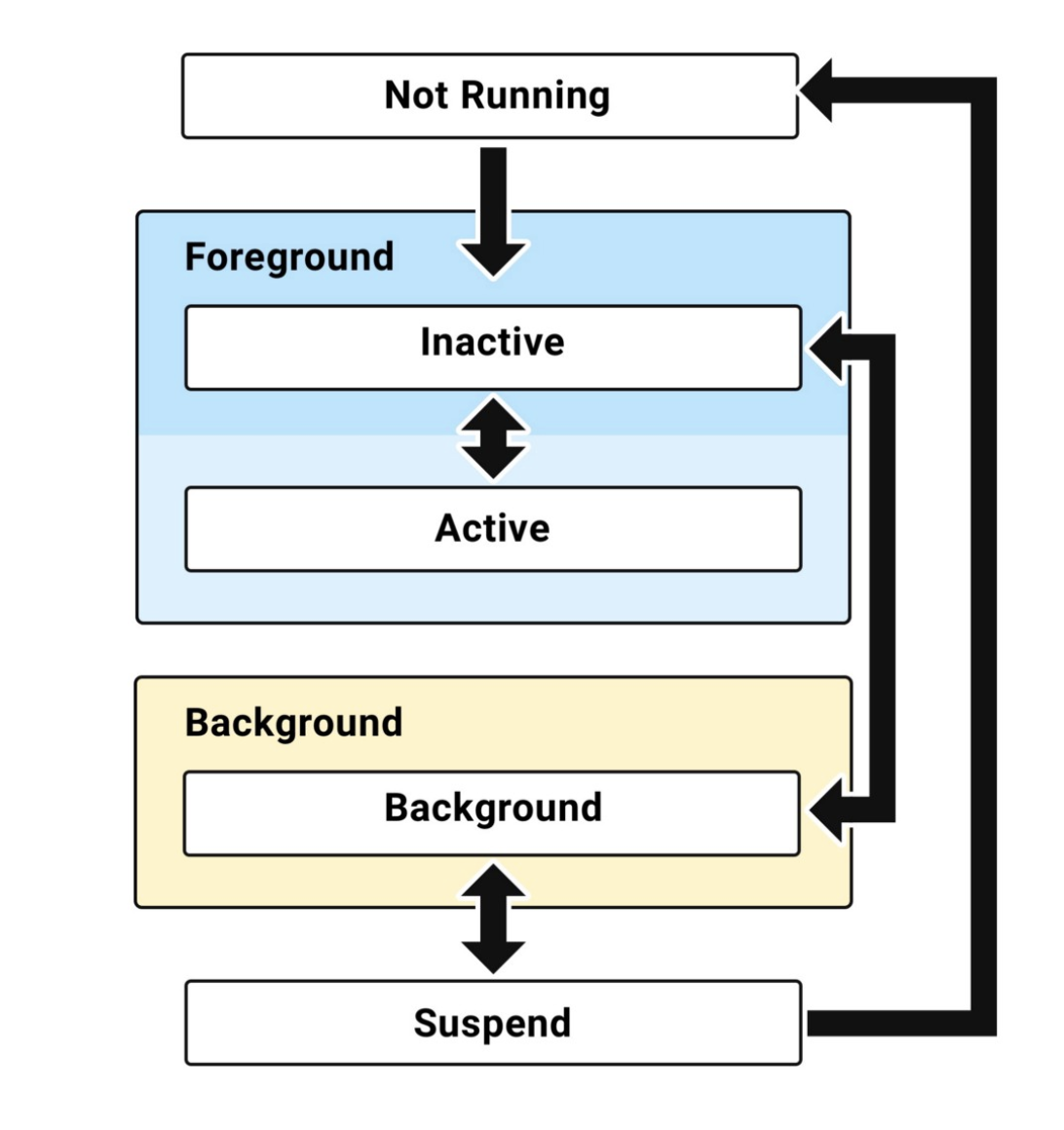 - 오직 하나의 App만 Foreground 상태를 가지며 inActive와 Active의 두가지 상태로 나뉘어집니다.