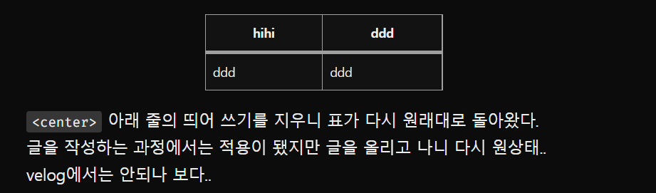 <center> 아래 줄의 띄어 쓰기를 지우니 표가 다시 원래대로 돌아왔다.