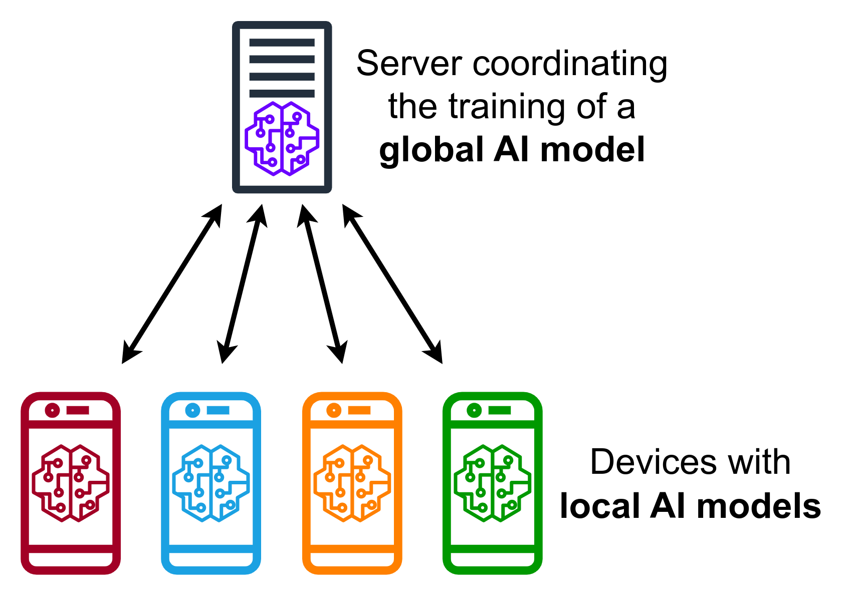 대신, 로컬 기기(휴대폰 등)에서 기기에 저장된 데이터로 모델을 학습한 후에 학습 결과(모델의 가중치)만 중앙 서버에 전송하는 겁니다.