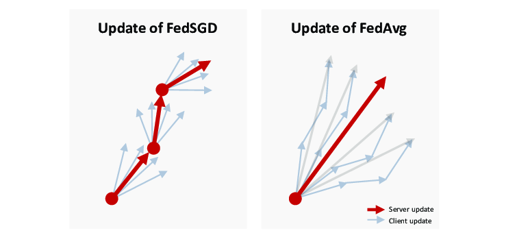 가장 큰 차이점은 클라이언트가 자체적으로 여러번 모델을 학습시킨 이후에, 그 결과를 서버에 공유한다는 점입니다.