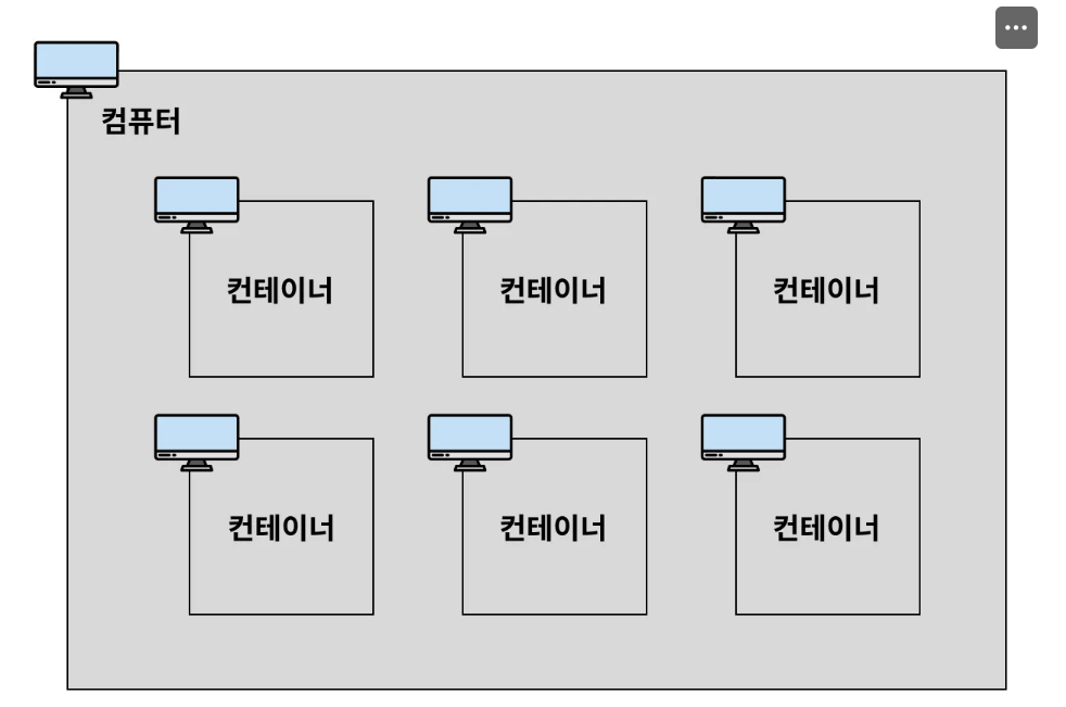 - 하나의 컴퓨터 환경 내에서 여러개의 미니 컴퓨터(=컨테이너) 환경을 구성할 수 있는 형태