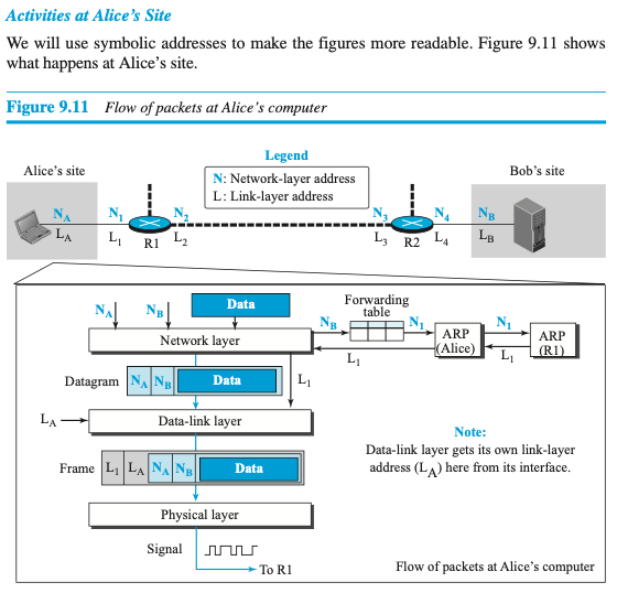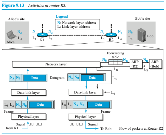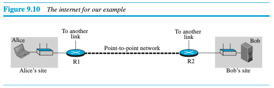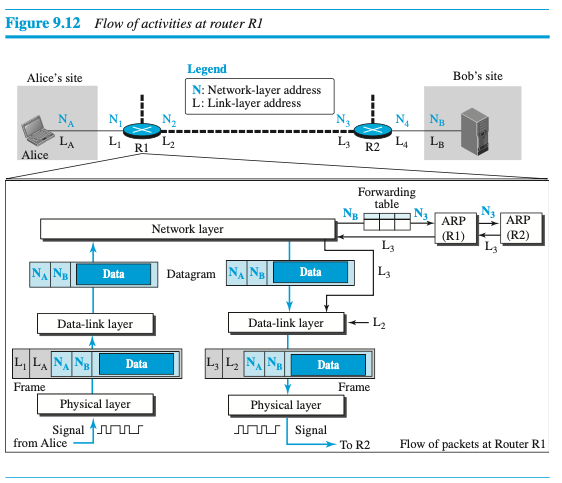 이 예제를 통해 발신지와 목적지 네트워크층 주소인 가 데이터 전송 도중에 변경되지 않는 것을 보았다. 그러나 라우터 R1과 R2의 네트워크층 주소()는 앨리스의 컴퓨터에서 밥의 컴퓨터로 데이터그램을 전송해야 한다.