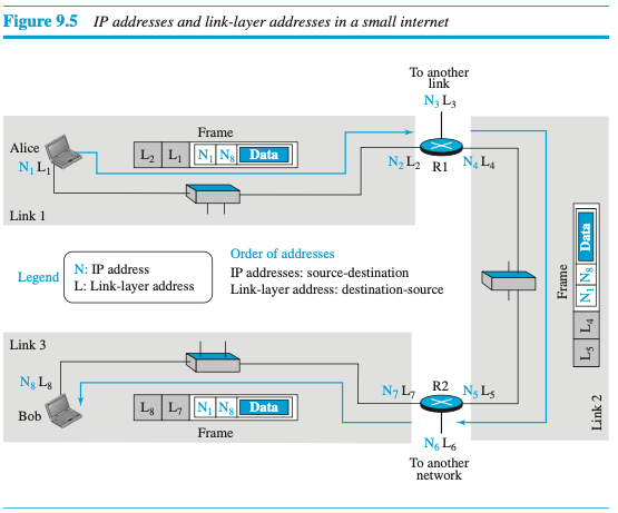 데이터그램이 네트워크층(3)에서 데이터 링크층(2)으로 전달될 때, 데이터그램은 프레임으로 캡슐화되고 두 데이터 링크 주소는 프레임 헤더에 추가된다. 이 2개의 주소는 프레임이 링크에서 다른 링크로 이동할 때마다 변경된다.