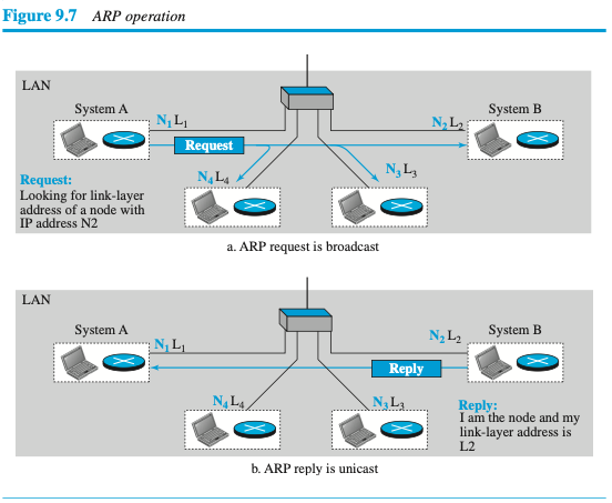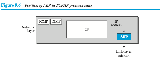 (이 책에서는 이 프로토콜이 IP주소를 지정된 링크 계층 주소에 매핑시키고, 데이터 링크층으로 그것을 전달하기 때문에 해당 챕터에서 설명한다.)