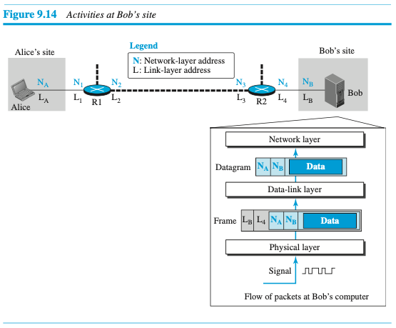 밥 측에서는 더 이상 주소 지정과 주소 매핑은 필요하지 않다. 링크로부터 전달된 신호는 프레임으로 변경된다. 프레임은 데이터 링크층으로 전달된다. 거기에서 데이터그램을 역캡슐화하고 네트워크층으로 전송한다. 네트워크층에서는 메시지를 역캡슐화하고 전송층으로 전송한다.