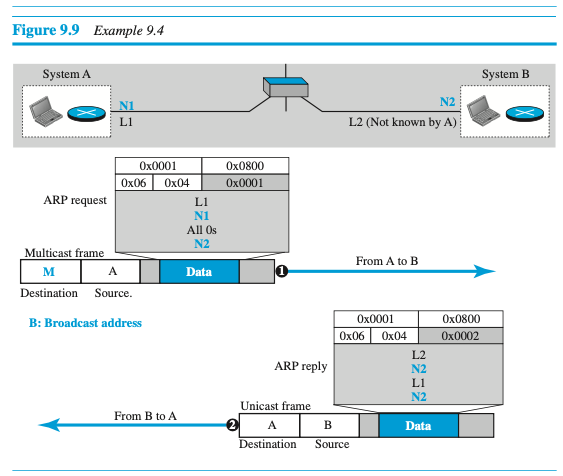 IP주소가 N1이고 MAC 주소가 L1인 호스트는 IP 주소 N2와 물리 주소 L2(처음 호스트에게 알려지지 않은)를 가진 다른 호스트로 전송할 패킷을 가지고 있다. 두 호스트는 같은 네트워크에 있다.