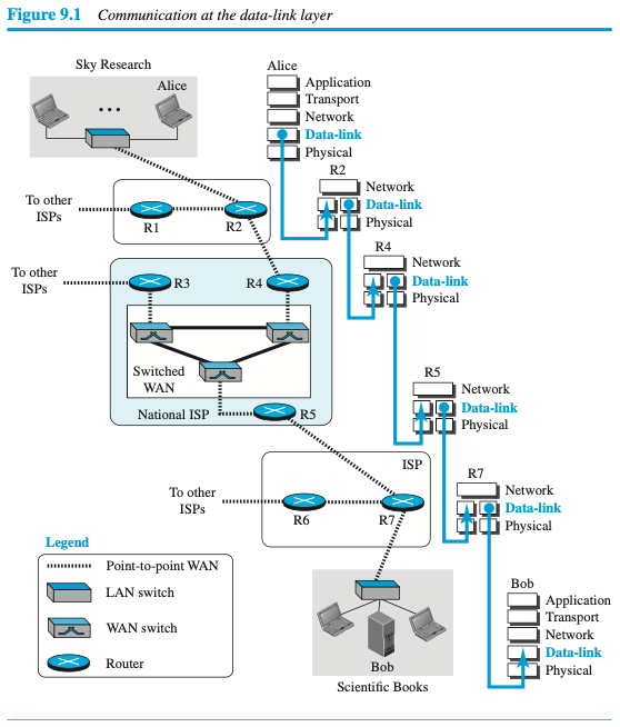 데이터 링크층의 통신은 노드-대-노드이다. 인터넷에서 한 지점의 데이터 단위는 다른 지점에 도달하기 위해 LAN과 WAN과 같은 많은 네트워크를 통과하게 된다. 이러한 LAN과 WAN은 라우터를 통해 연결된다. 이것은 2개의 종단 호스트와 라우터를 노드(Node)로 그리고 두 노드 사이의 네트워크를 링크(Link)로 나타내는 것이 일반적이다.