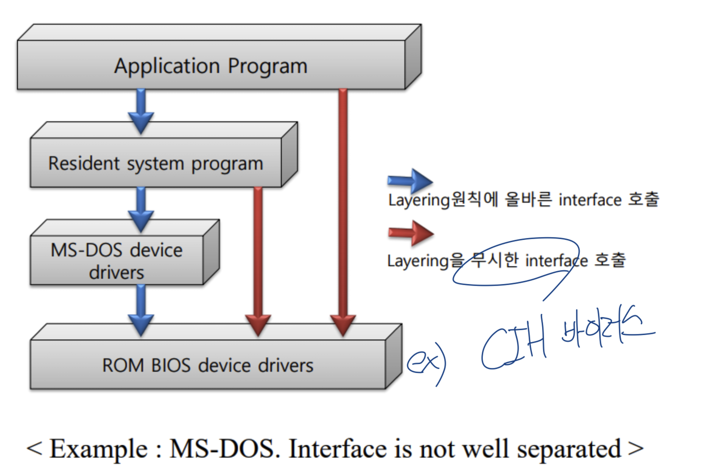 MS-DOS에서는 Layering 원칙을 무시한 Interface 호출로 인한 취약점이 존재했다.
