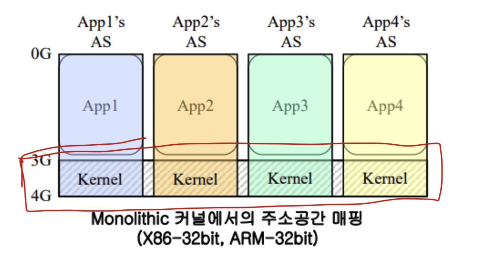 Kernel의 모든 Service가 같은 주소 공간에 위치