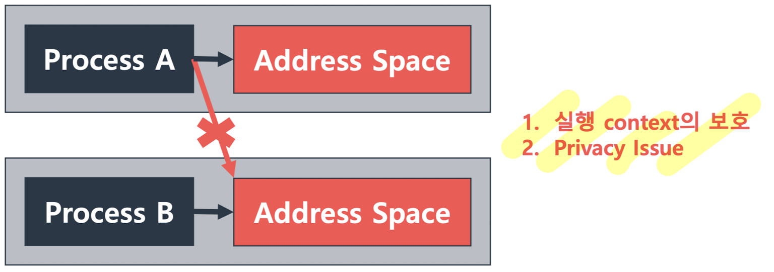 - Protection Domain : 서로의 공간을 침범할 수 없음 (멀티 프로세스는 예외지만...)