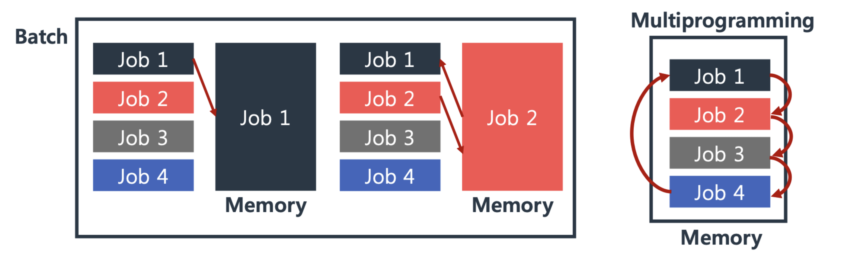 왼쪽이 Batch 시스템 (Job1이 끝나야, Job2가 실행됨)