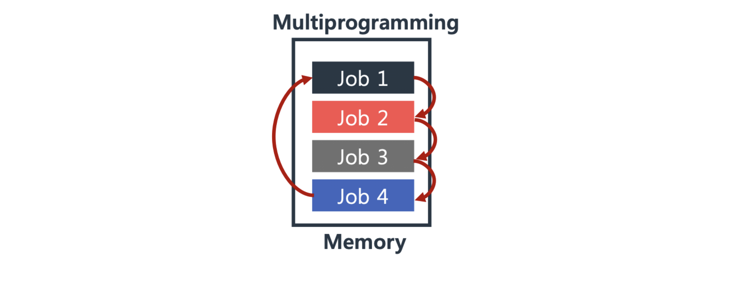 OS는 여러 개의 작업을 메모리에 동시에 유지하고, 현재 실행중인 작업이 I/O를 할 경우에 다음 작업을 순차적으로 실행한다.