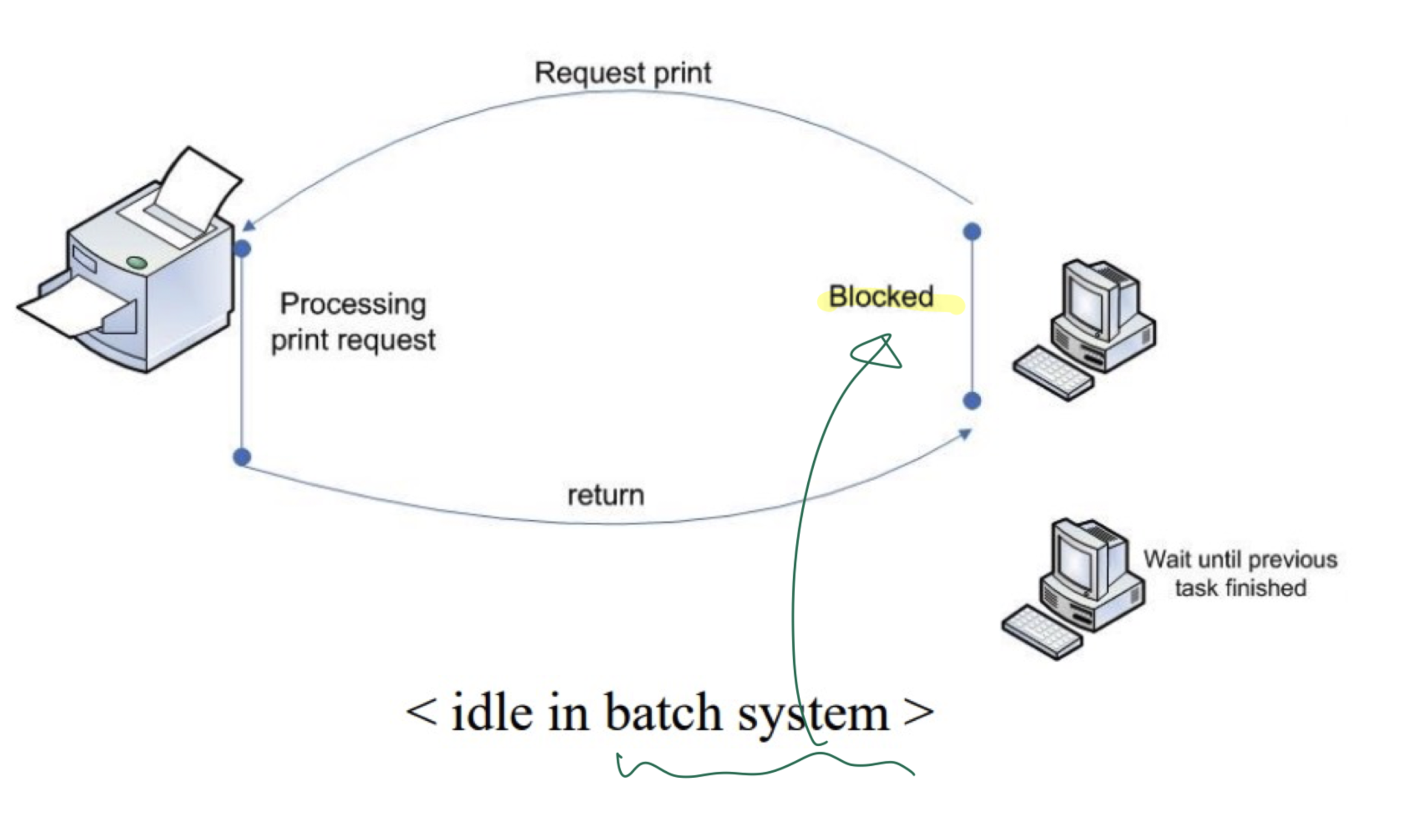 프린터로 요청을 보내면 프린터가 작업을 완료할 때 까지 Blocked