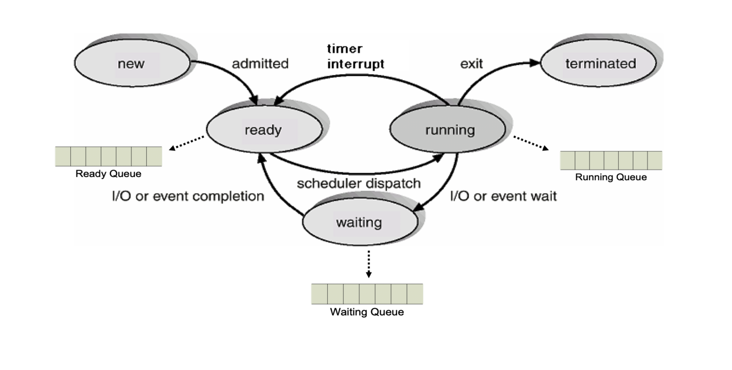 커널 내에 Ready Queue, Waiting Queue, Running Queue를 두고 프로세스들을 상태에 따라 관리한다.