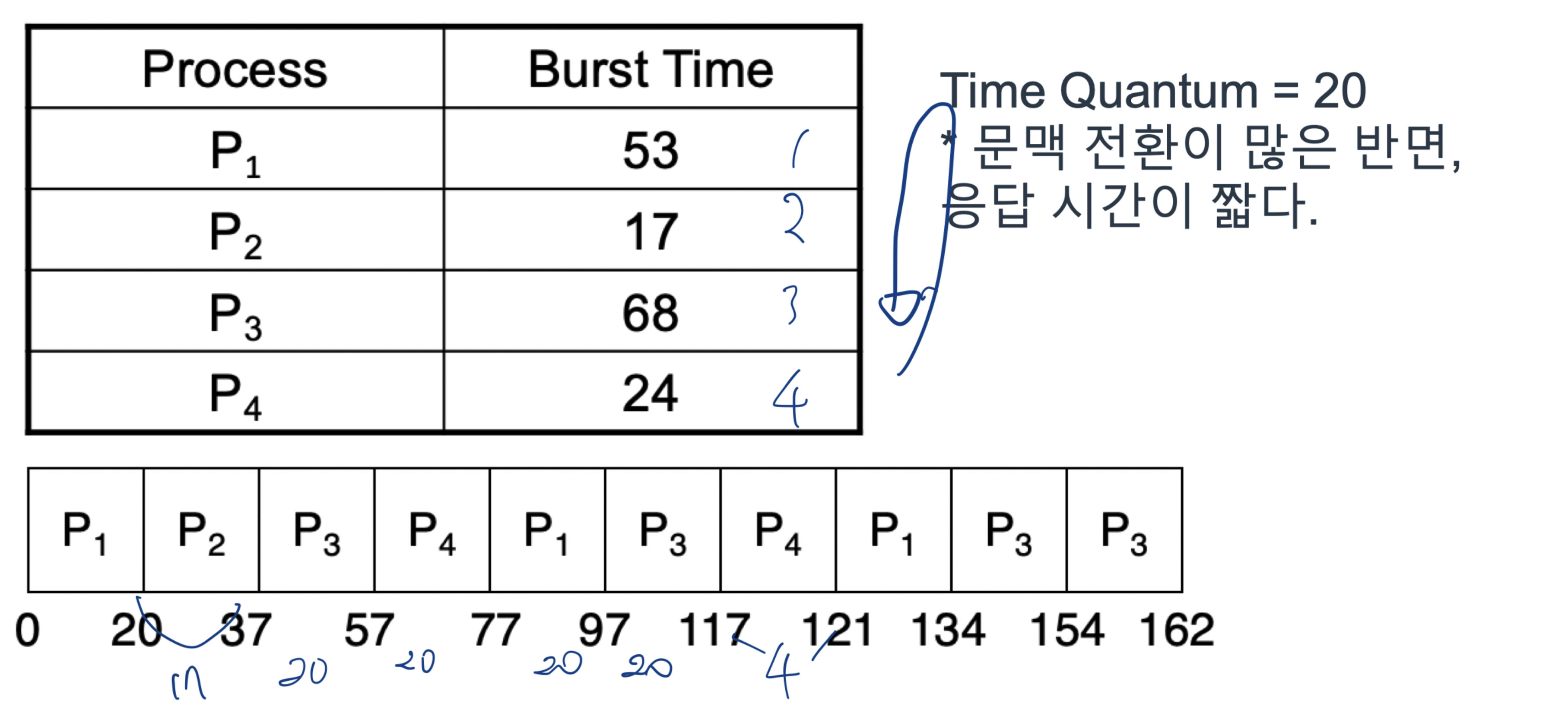 - Time Quantum만큼 수행 한 Process는 Ready Queue의 끝으로 들어가 다시 할당을 기다림