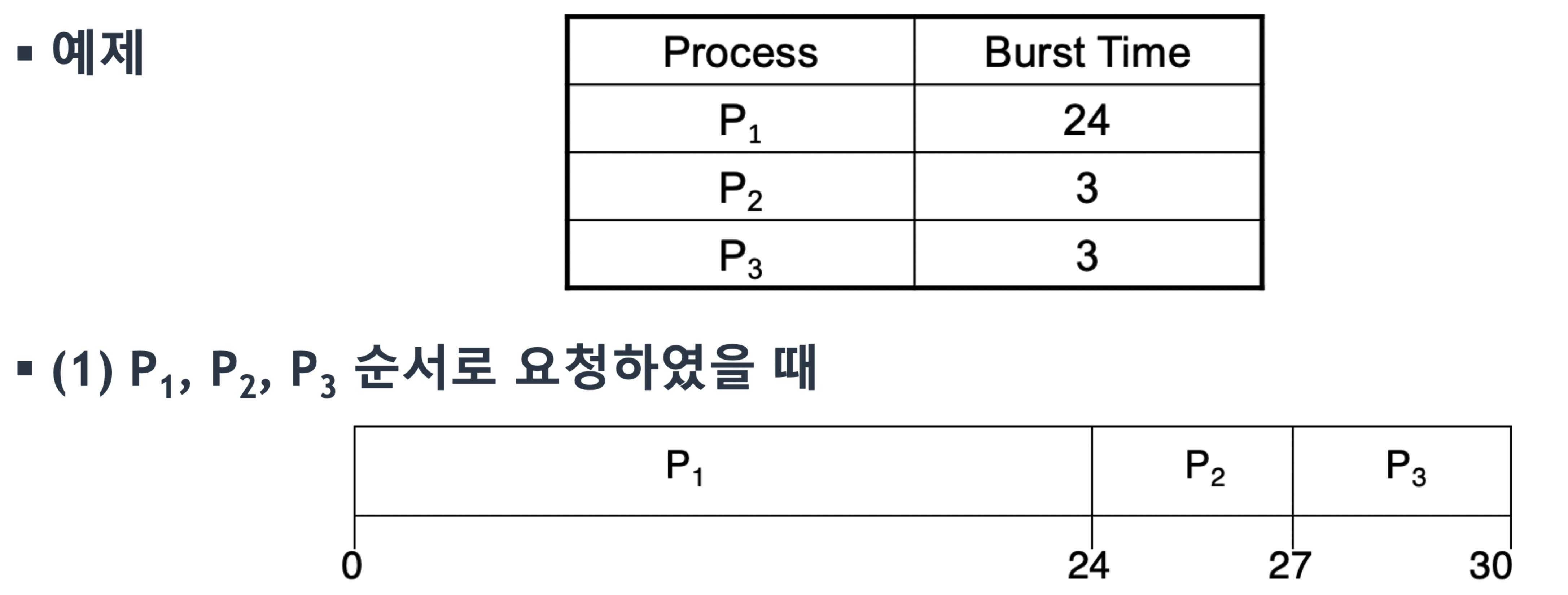 먼저 CPU 할당을 요청한 Process에 CPU를 먼저 할당한다.